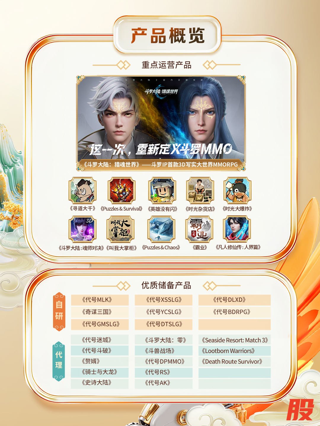 7月,公司获《斗罗大陆》小说与动漫双授权的自研游戏《斗罗大陆:猎魂世界》开启公测,产品上线前便获得超过千万玩家预约,上线后迅速登顶iOS免费榜,成为公司深耕MMORPG赛道又一精品力作。在2025年7月伽马数据新游首月流水测算榜中,《斗罗大陆:猎魂世界》位列榜首。