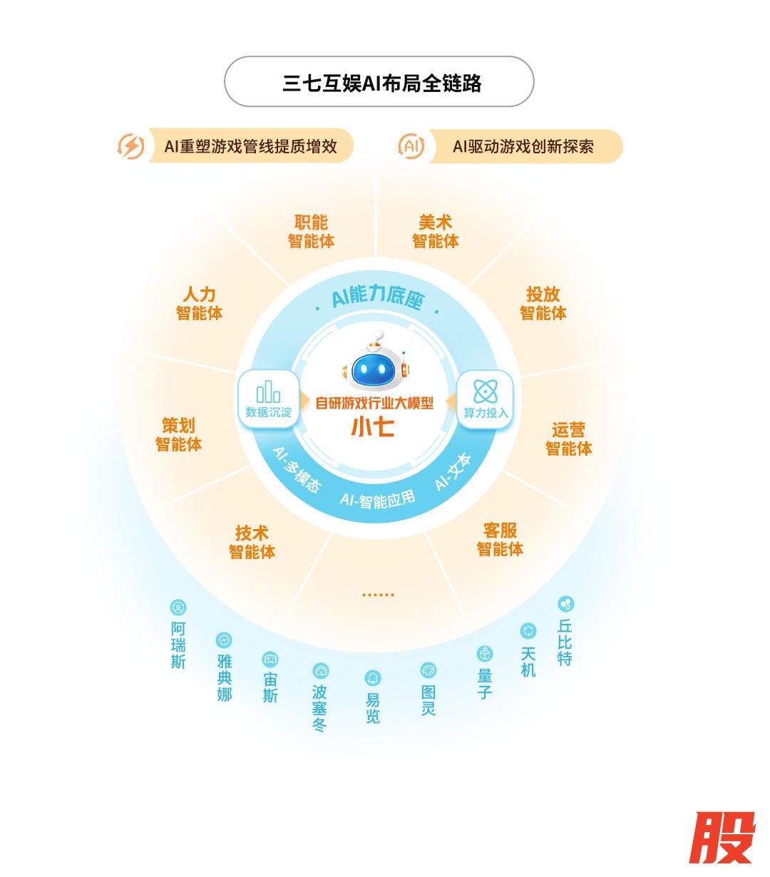 通过持续进行内部训练与推理优化,三七互娱自主研发游戏领域行业大模型“小七”,并基于“小七”及引入行业先进的外部大模型集群,构建40余种AI能力,构建“小七”智能体平台,覆盖市场分析/产品立项/美术设计/开发辅助/广告投放/运营分析/智能客服/通用办公等各业务领域。