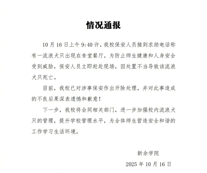 10月16日上午9时40分许,学校保安人员接到求助电话称有一流浪犬只出现在食堂餐厅,为防止师生健康和人身安全受到威胁,保安人员立即赶赴现场,因处置不当导致该流浪犬只死亡。